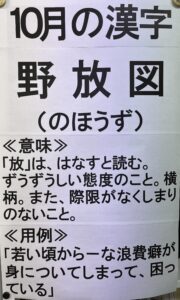 野放図(のほうず) ≪意味≫「放」は、はなすと読む。ずうずうしい態度のこと。横柄。また、際限がなくしまりのないこと。 ≪用例≫ 「若い頃から-な浪費癖が身についてしまって、困っている」