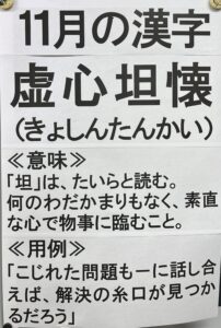 虚心坦懐(きょしんたんかい) ≪意味≫「坦」は、たいらと読む。何のわだかまりもなく、素直な心で物事に臨むこと。 ≪用例≫ 「こじれた問題も-に話し合えば、解決の糸口が見つかるだろう」