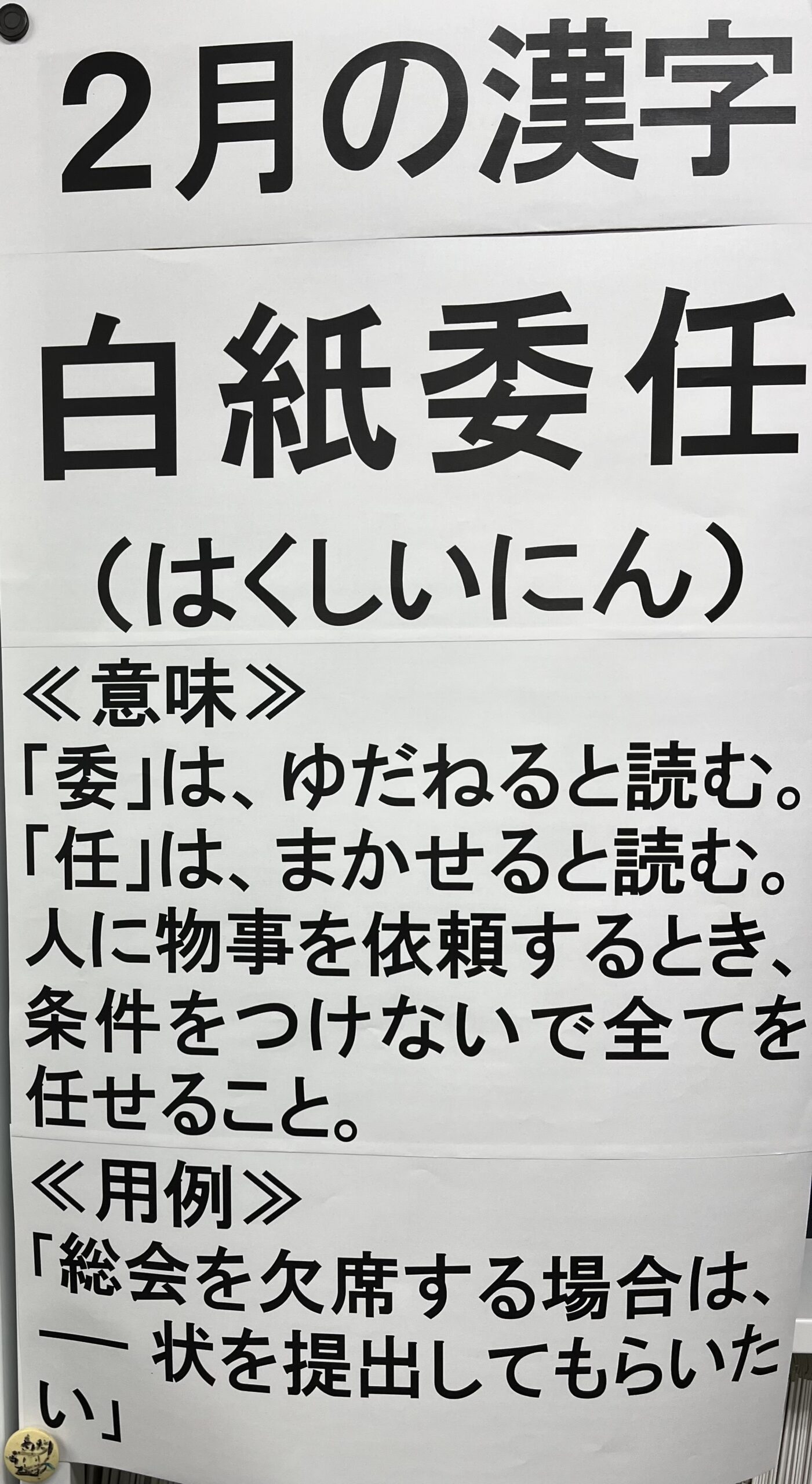 2月の漢字を、事務所のインフォメーションに掲載しました。